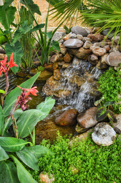 An elegant water garden with thoughtfully chosen water plants, in addition to